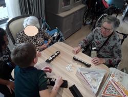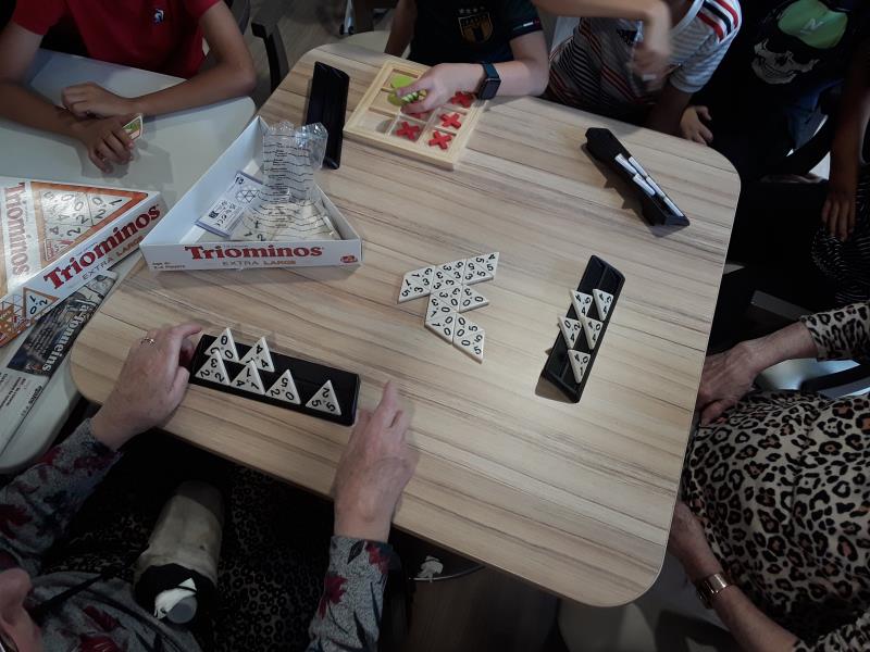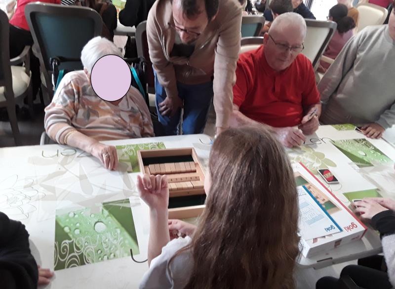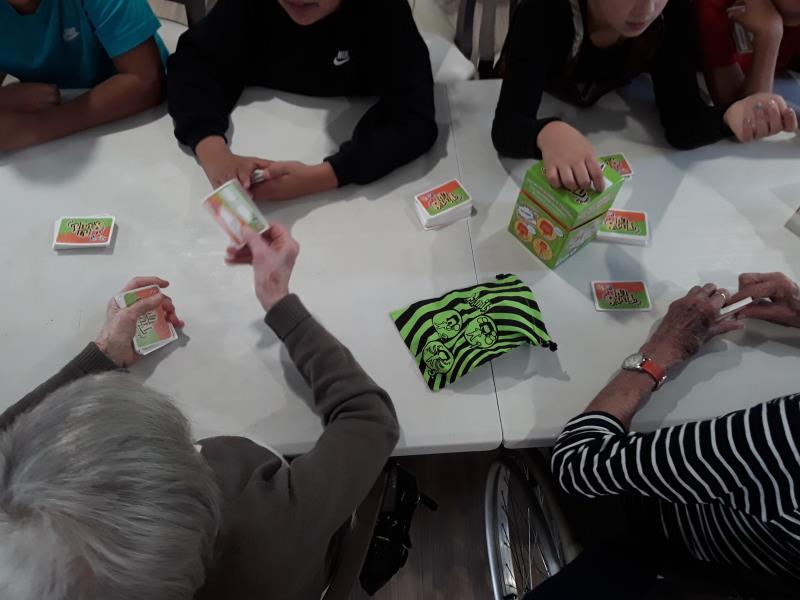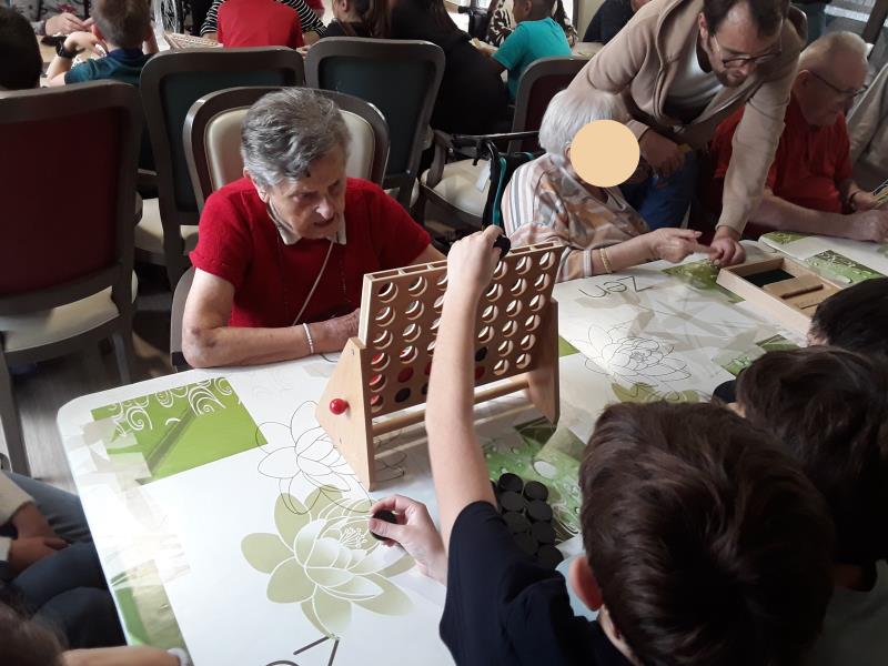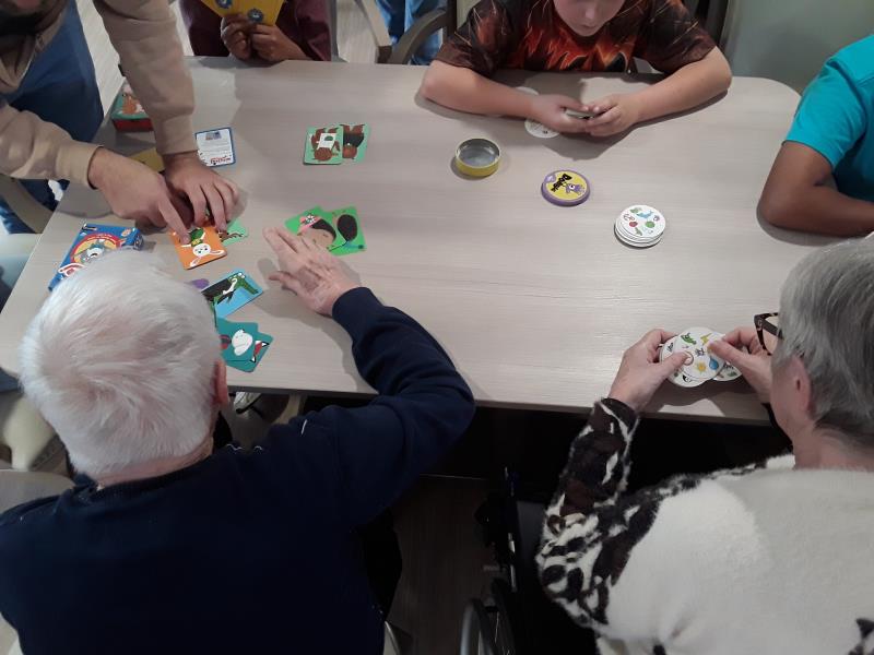 Après ce temps musical, place aux jeux de société ! Résidents et élèves ont coopéré autour de parties animées de Puissance 4, Dobble, Triominos, cartes, Shut the Box, Tic Tac Toe et Times Up. Les rires et échanges ont rythmé cet après-midi, créant de véritables liens entre générations.