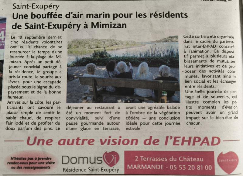 Résidence Saint Exupéry > Actualités > Un air marin vers Mimizan Un air marin vers Mimizan Publiée le 17/10/2025 Article du journal "Le Républicain" du 16/10/2025, sur la sortie à Mimizan le 18 septembre 2025.