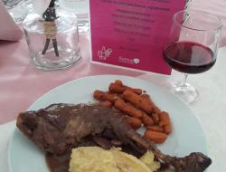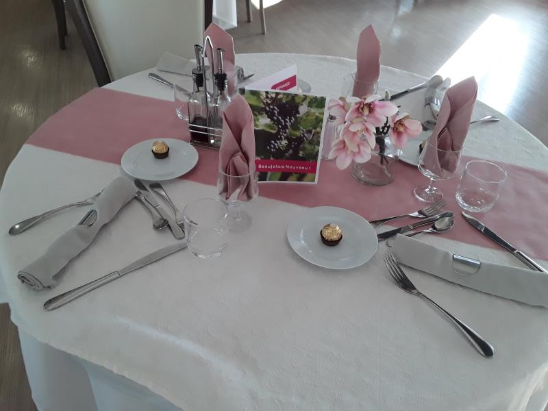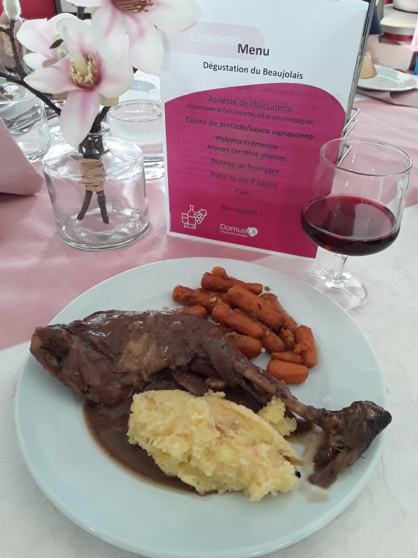 Les résidents ont partagé un agréable moment autour d’un repas festif : dégustation du Beaujolais nouveau, assiette de charcuterie, suivie d’une cuisse de pintade à la sauce vigneronne, accompagnée de polenta crémeuse et de carottes glacées. Le fromage a précédé un dessert gourmand : une poire au vin d’épices.